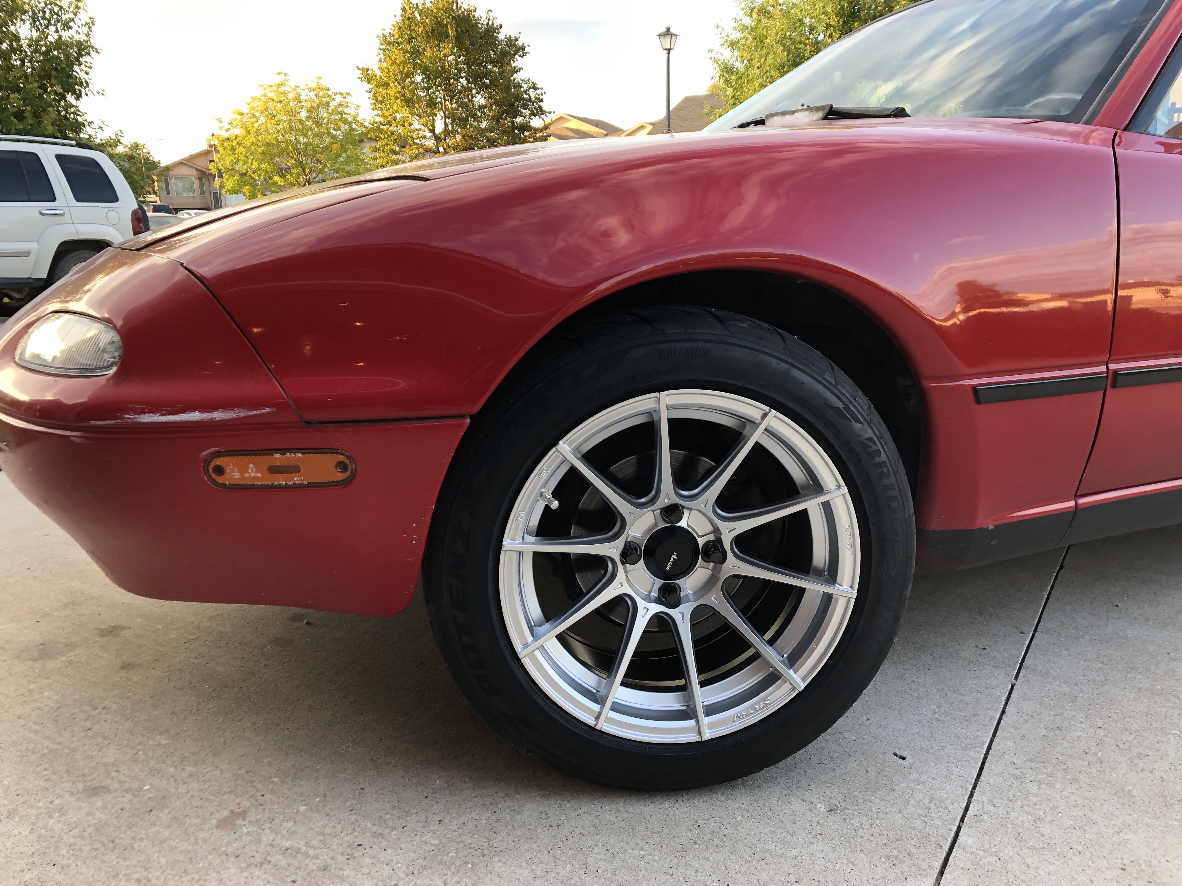 These wheels weigh 11 pounds and are a lot lighter than the Mille miglia wheels that came with the car. Costco wouldn’t fit them because the size wasn’t in their database, but a friend at the track was able to do it for me. These wheels look awesome.