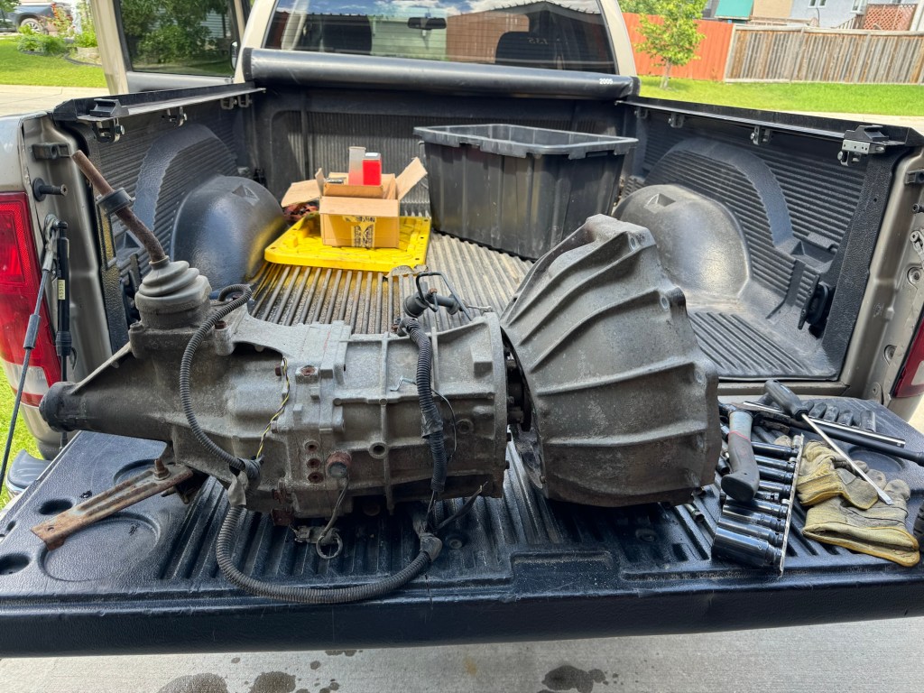 Pretty much what it says, I brought the AR five transmission home and removed the Bell housing. The only thing interesting that happens is the transmission rolled over in the back of the truck bed and I got transmission fluid all over the truck bed which took me forever to clean up.